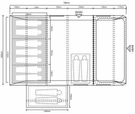 Darkened Inner bedrooms also offer a better night’s sleep, with a longer depth of 240cm, making them ideal for fitting larger airbeds, or camp beds into the inner pod lengthways, to maximise the space inside the sleeping pods. Further to this, additional sleeping inners can be purchased for the side extension, and the main living space, boosting capacity to 11 people.