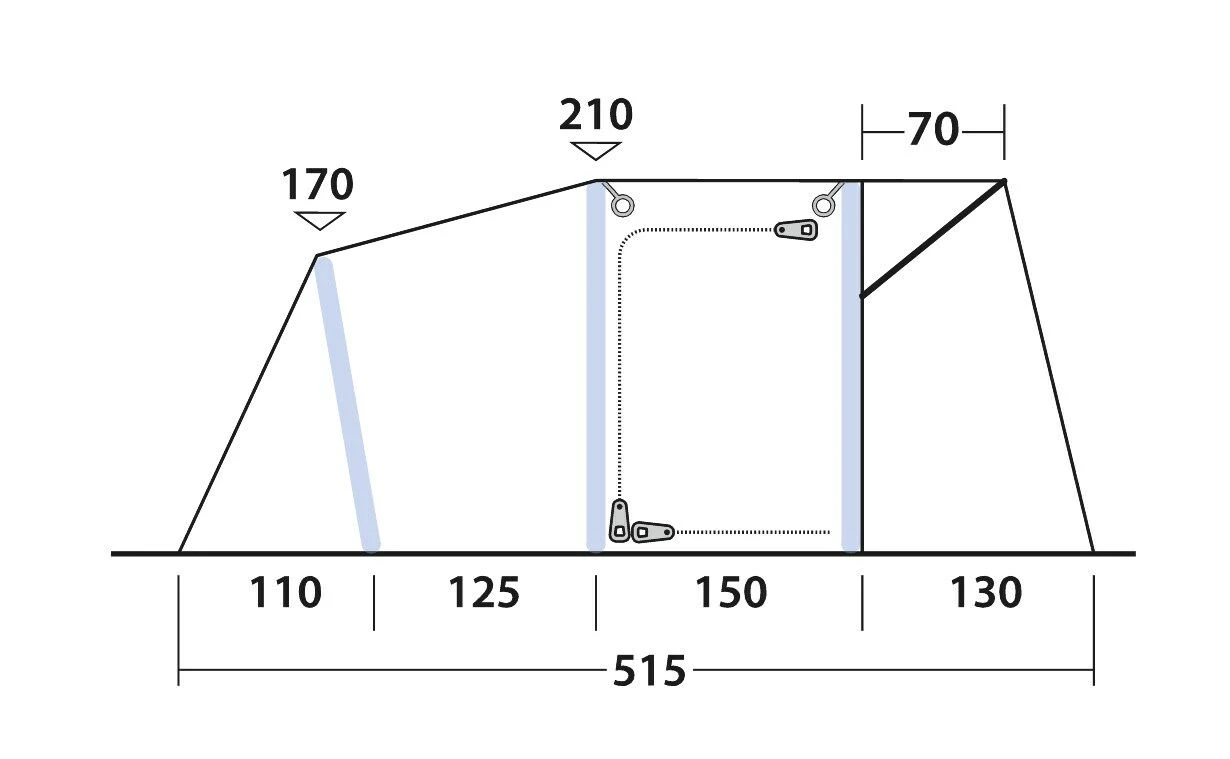 | Features | Designed for Camper Vans with a fitting height from 175-200cm. Vertical front wall with canopy for enhanced interior and exterior living space. Two large side doors with insect-proof mesh screen backing. Spacious living area with large tinted windows for a light-filled interior with curtains for privacy. Double zips allow full front opening, backed by full mesh panel for insect-free ventilation options. Pre-shaped air tubes provide great headroom and interior space. HookTrack System for versatile positioning of lights and items up to 1.5kg. Pre-attached luminous guylines for convenience and fast pitching. Groundsheet for Link Access Zone with built-in draught excluder skirt. Optional dark-fabric inner for sleep or storage. |