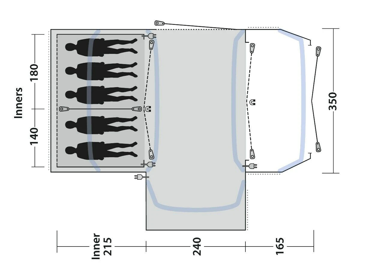 The Outwell Oakdale 5pa, from the Prime Air collection is a tent suitable for families, with an inflatable structure to improve the pitching time when setting up. Sleeping up to five people in a spacious design, with a wing lounge built into the side as an excellent area to socialise of an evening. Furthermore, the wing lounge gives it a brighter and airy feel. The Oakdale 5pa offers a panoramic feel and outlook, allowing you great views of the local surroundings, whilst still offering all the classic features expected from a larger tent, such as a sewn in groundsheet, and the Quick and Quiet doors – a superb Outwell innovation. The NEW Darker bedrooms offer a better night’s sleep, by reducing the early morning light.