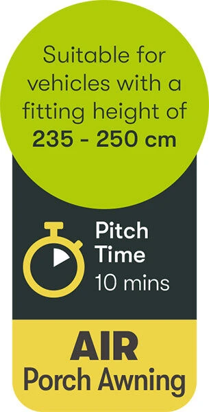Designed to be lightweight, budget and user friendly, due to the lightweight fabric a smaller pack size is achieved, simply deflate your beams and roll it down with no fuss – pitching it is just as easy it can be done by 1 person in around 10 minutes, you can remove some panels to make it even lighter which helps when gliding it on to the van rail. For a perfect fit it requires the height of the fitting rail on the van to be between 235 – 250cm
